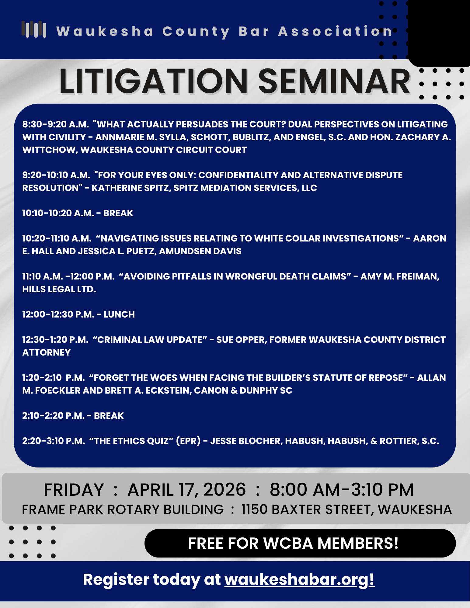 This is the last full week to register for the April 17th Litigation Seminar. Log into your WCBA account and register today!